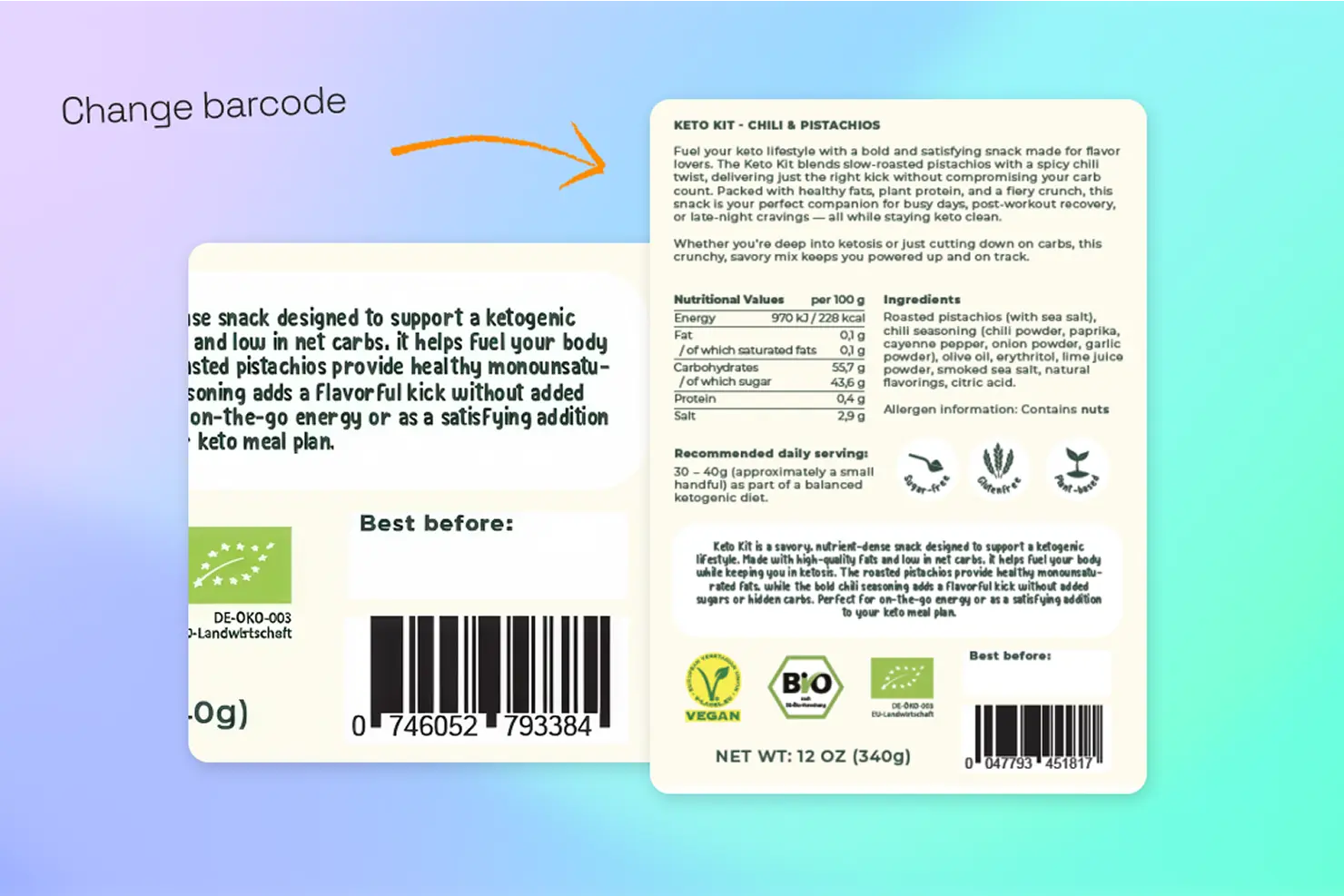 Easily handle text, ingredients, icons, barcodes and colours