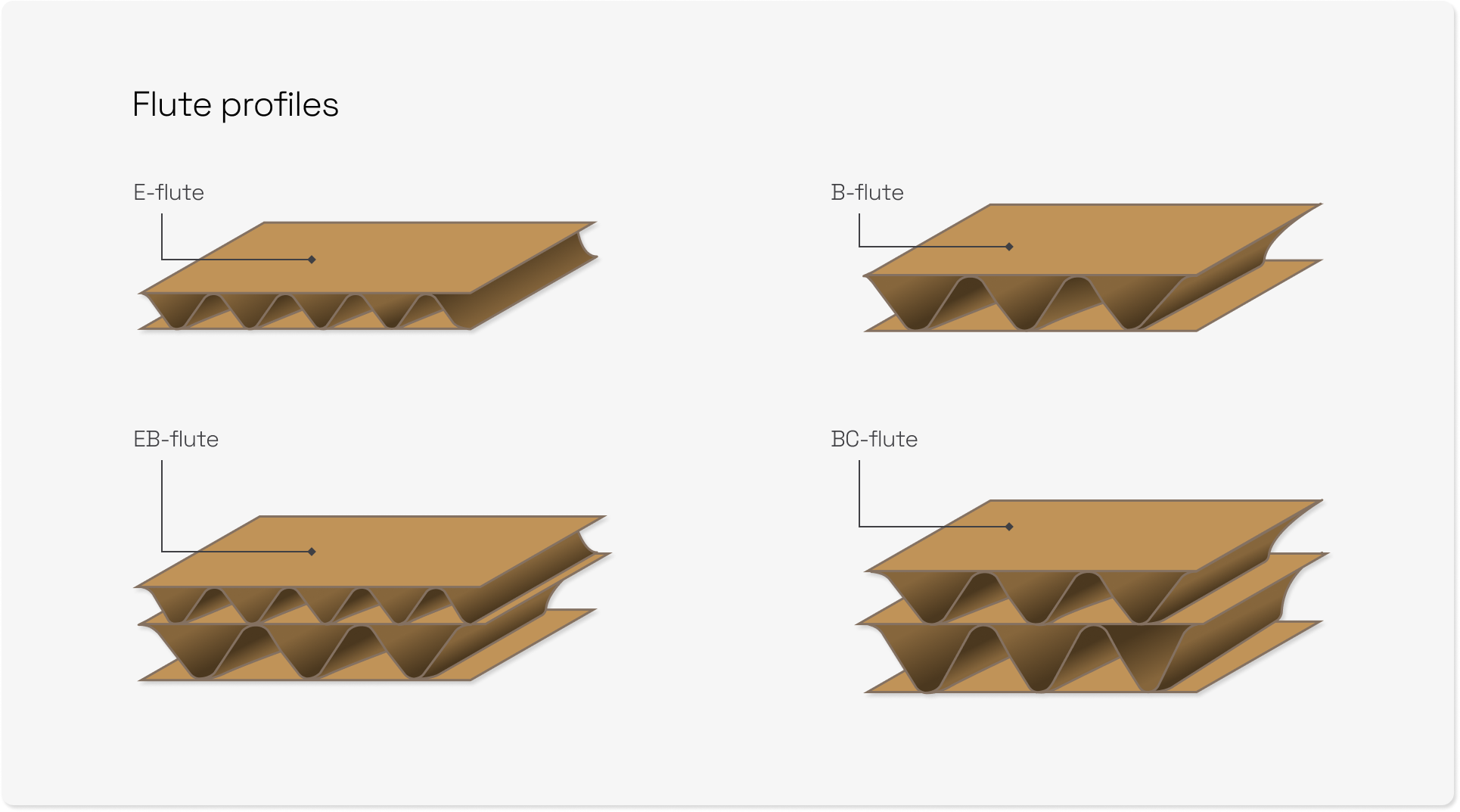 Fluting comes in different sizes, which are referred to as “flute profiles”. Some profiles are made from a single layer of fluting, like E-flute and B-flute, whilst others are made from two layers of fluting, like EB-flute. Each has its merits and limits, which is why it’s important to know what each means for your corrugated packaging. E-flute, for example, is ideal for printing on because of its high number of flutes (individual waves) per foot. This creates a smooth surface that doesn’t distort images and other artwork when printed on. At the same time, it’s too thin for shipping large, heavy products. Understanding flute profiles allows you to balance trade-offs and choose the fluting that best meets your exact needs.