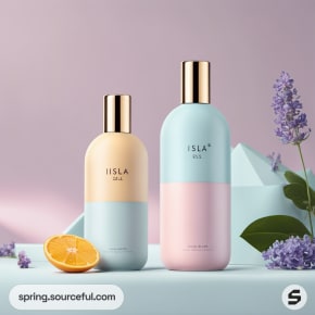 Two pastel cylindrical bottles with gold caps and floral decor.