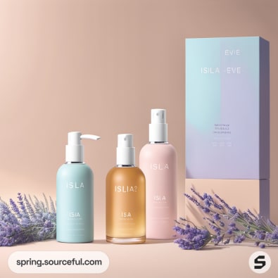 Square pastel lotion bottles with lavender and lemon on blue backdrop.