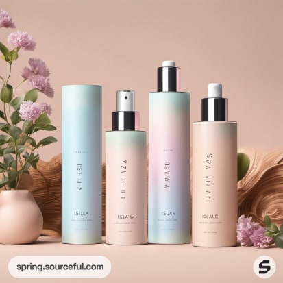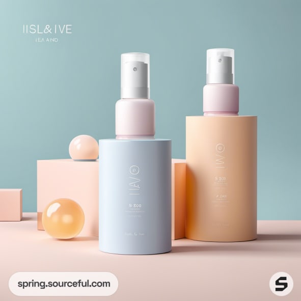 Pastel blue and peach cylindrical spray bottles on a light blue background.