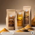Box and sachet packaging on sand backdrop with bowl of sand.