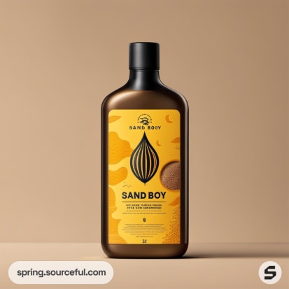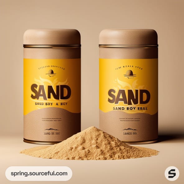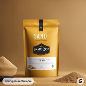 Pouch and cylinder labeled 'Sand Sand Boyy' with sand pile.