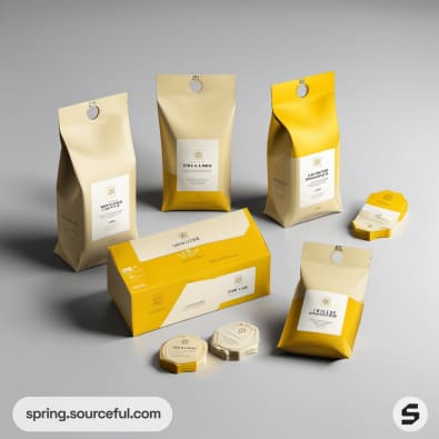 Various yellow and beige resealable pouches and boxes.