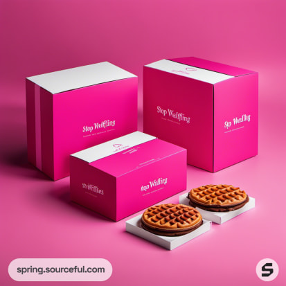 Three pink and white boxes with waffles on pink background.