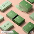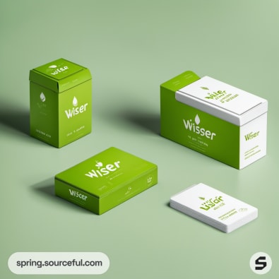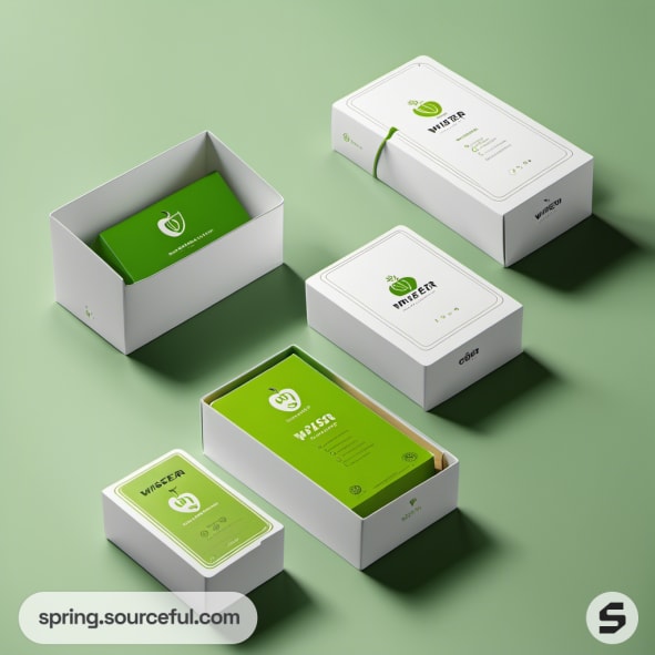Green and white mailer boxes with leaf and fruit designs on a green background.