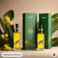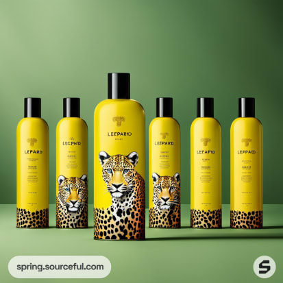 Yellow bottles with leopard imagery on a green background.