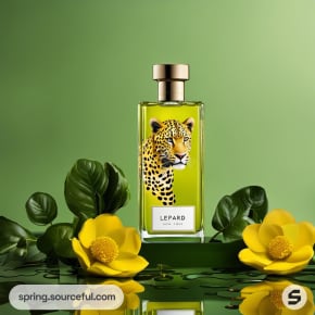 Perfume bottle with leopard design on green background, surrounded by yellow flowers and leaves.