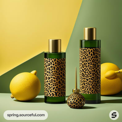 Green bottles with leopard print labels and citrus fruits against a yellow and green background.