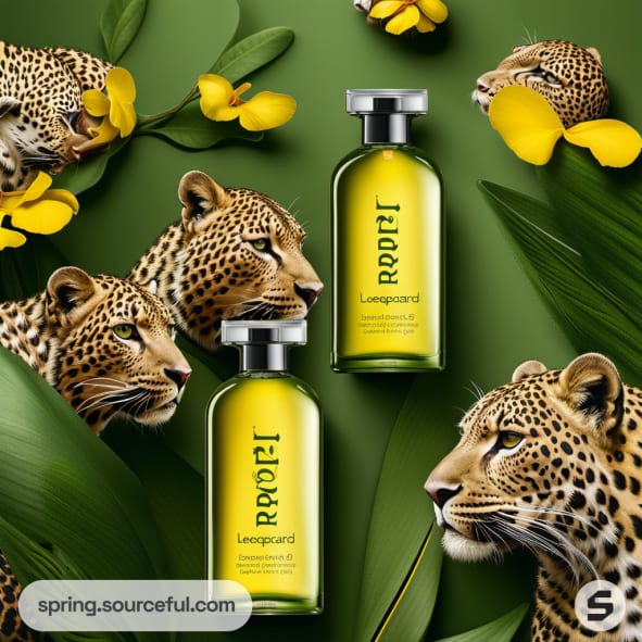 Perfume bottles and green boxes with leopard print design, surrounded by leaves and yellow flowers.