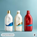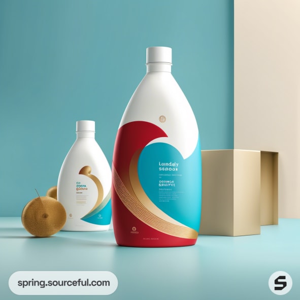Plastic bottles with teal and red wave designs against a minimalist background.