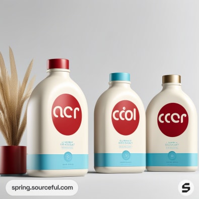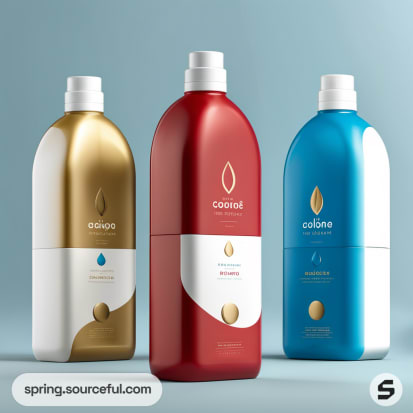 Three colorful detergent bottles; two red and one gold, with blue and white labels, on a neutral background.