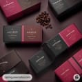 Assorted coffee box packaging in black and burgundy with coffee beans on a surface.