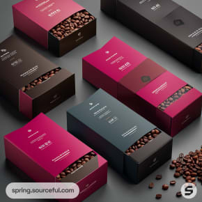 Rectangular coffee packaging boxes in black and pink, with coffee beans scattered around on a gray surface.