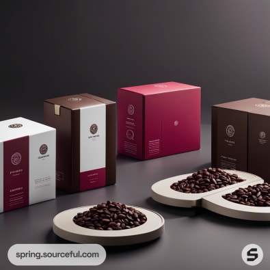 Premium coffee packaging with beans on trays, featuring burgundy, brown, and white mailer boxes on a dark background.