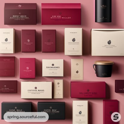 Assorted coffee boxes in black, red, and brown with coffee beans illustrations on a neutral background.