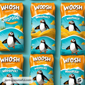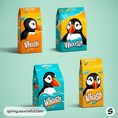 Orange and teal puffin-themed snack package with playful design.