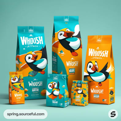 Assorted snack packages featuring puffins; vibrant orange and teal packaging.