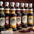 Several Murmite condiment bottles in various flavors with ingredients in the foreground.