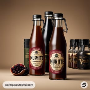 Four Murmite condiment bottles with natural elements like herbs and fruits.