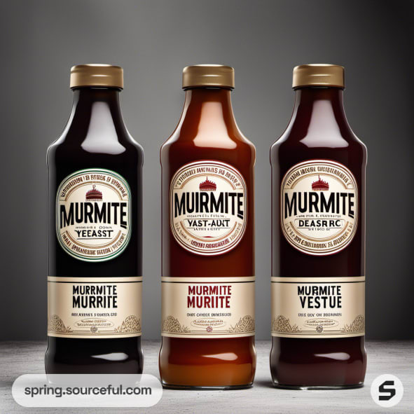 Three bottles of Murmite condiments with varied labels on a grey background.