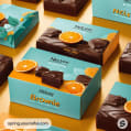 Boxes with teal and orange designs featuring chocolate brownies and oranges