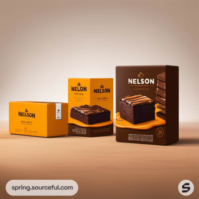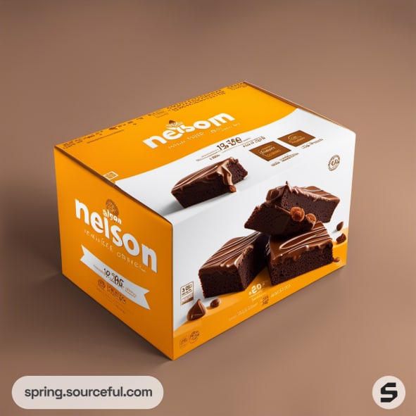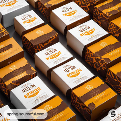 Brownie boxes with orange accents and chocolate slices on a wooden surface