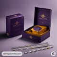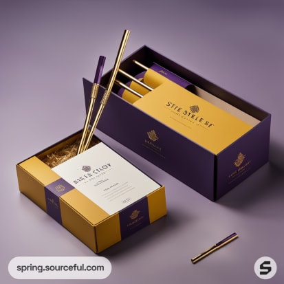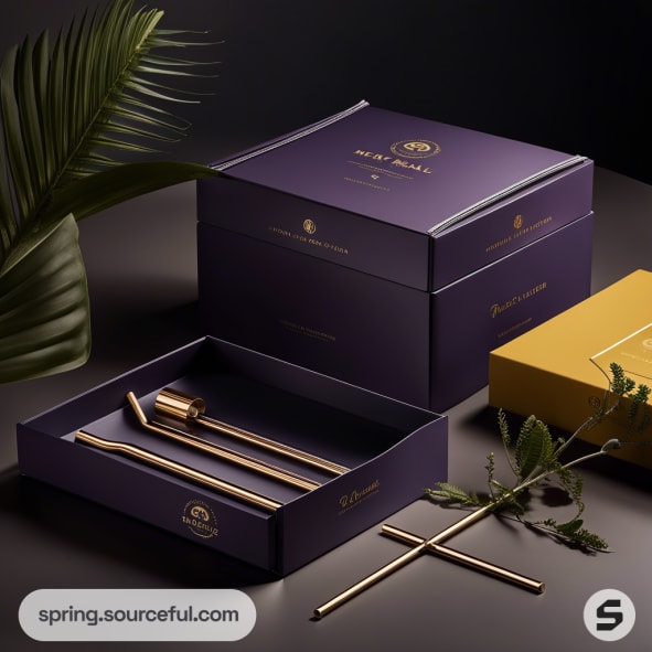 Purple rectangular box with gold accents and metal straws beside a yellow inner box.