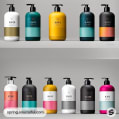 Nine colorful pump shampoo bottles in a vibrant, geometric design on shelves.
