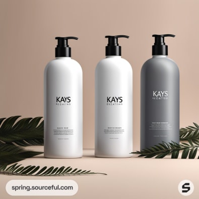 Three shampoo bottles with pump tops, featuring a modern design on a beige background.