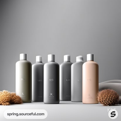 Six gradient shampoo bottles with subtle color variations and sponges on gray background.