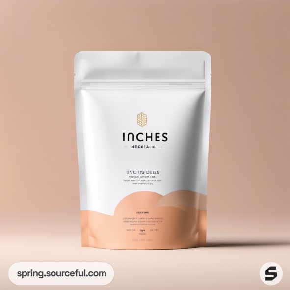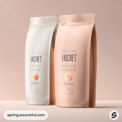 Two tall resealable pouches, one white and one peach, on a soft beige background.