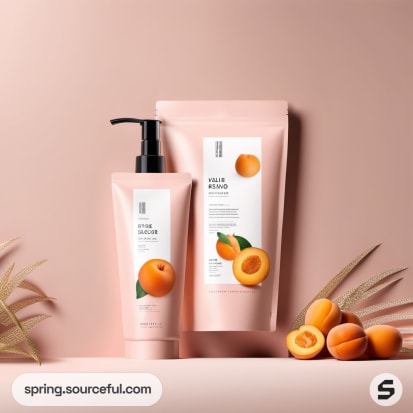 Pink bottled lotion and resealable pouch with apricot imagery and leaves.