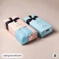 Gift boxes wrapped in textured blue and pink paper with beige ribbons on a brown surface.