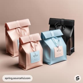 Matte paper bags in pink, blue, and black with textured fold-over tops on a neutral background.