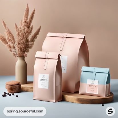 Two pastel-colored resealable coffee bags in pink and blue on a wooden surface, with dried flowers in a vase.