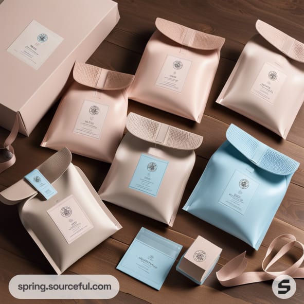 Assorted pastel resealable pouches on wooden surface.