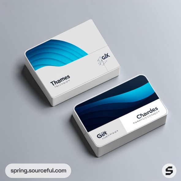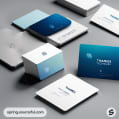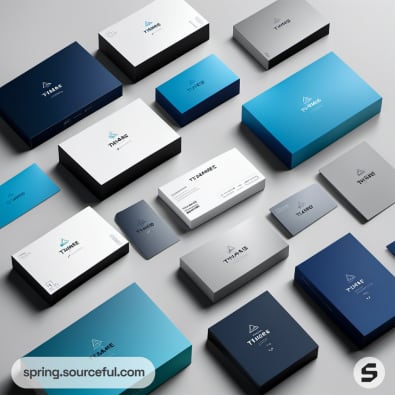 Modern business cards and boxes with blue gradient design.