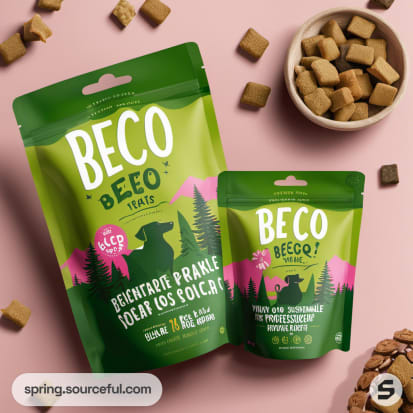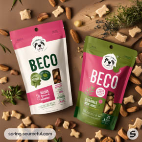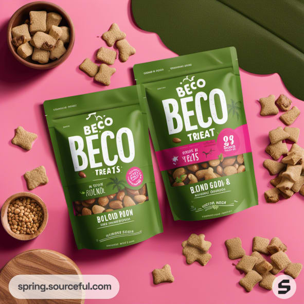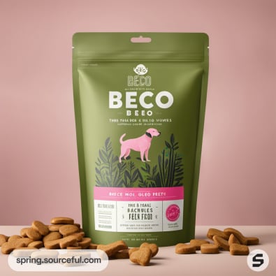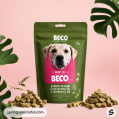 Green pouch of BECO dog treats with a dog image, kibble scattered.