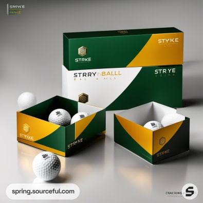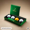 Green and gold packaging with golf balls.