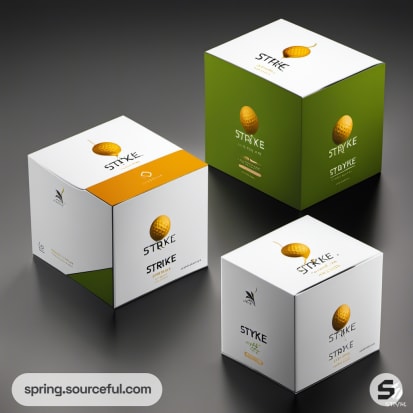 Gold and green boxes with single golf balls on display.
