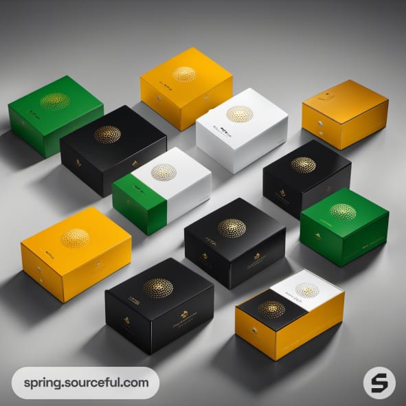 White and green rectangular boxes with gold hexagons.