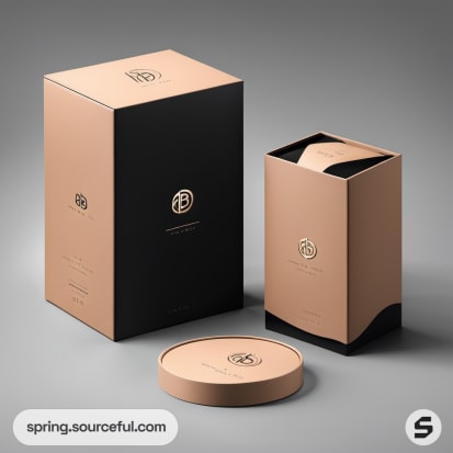 Black and peach packaging set with open boxes.
