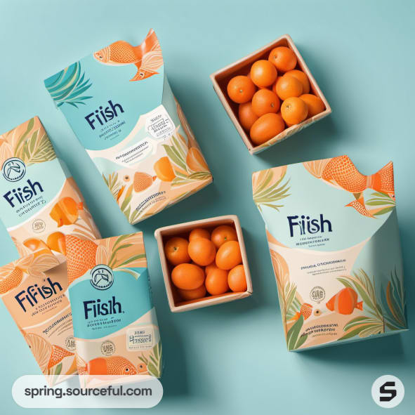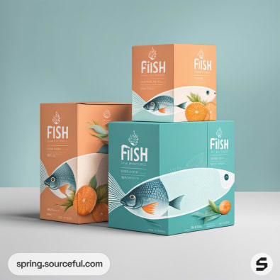 Stacked boxes with fish and orange graphics on teal and peach designs.