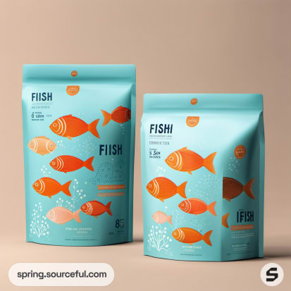 Teal resealable pouches with orange fish patterns on brown backdrop.