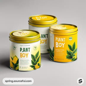 Three yellow tins with green leaf graphics, labeled 'Plant Boy'.