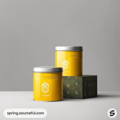 Yellow tins with orange flower graphics, labeled 'Plant Boy'.