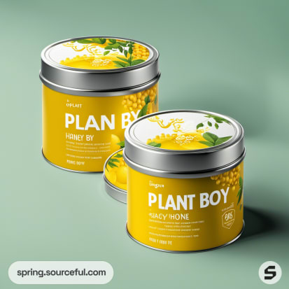 Circular tins with floral design, labeled 'Plant Boy Honey'.