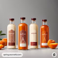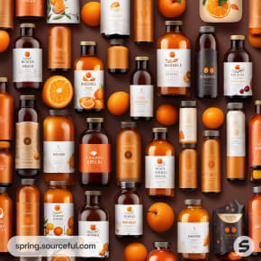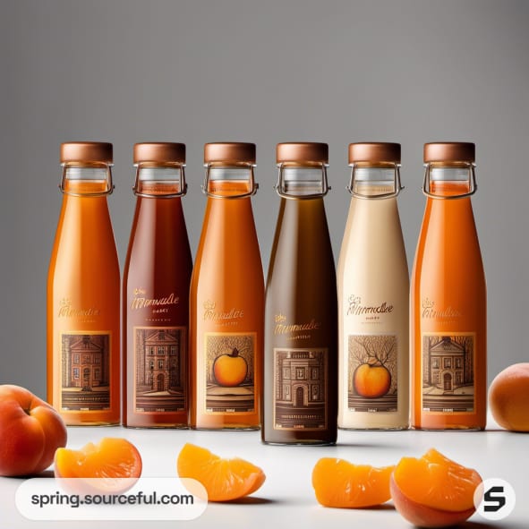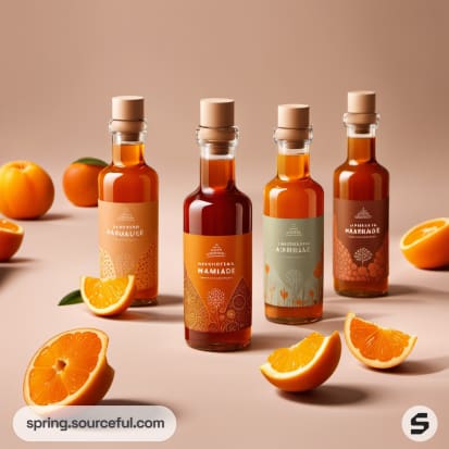 Assorted marmalade bottles in various shades of orange with fruit illustrations.