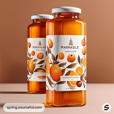 Two large jars of marmalade with orange fruit designs on a brown background.